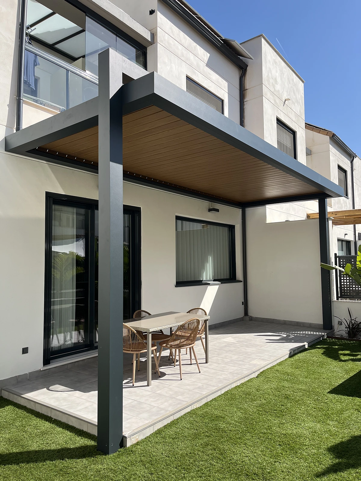 Versatilidad de techado: Puedes optar por una pérgola de madera con techo de lona, cristal o incluso policarbonato, adaptando el nivel de sombra y protección según tus necesidades.