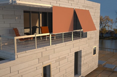 El sistema con brazo de punto recto conlleva el abatimiento frontal de los brazos del toldo con total independencia de los soportes superiores del tubo de enrolle de la lona.